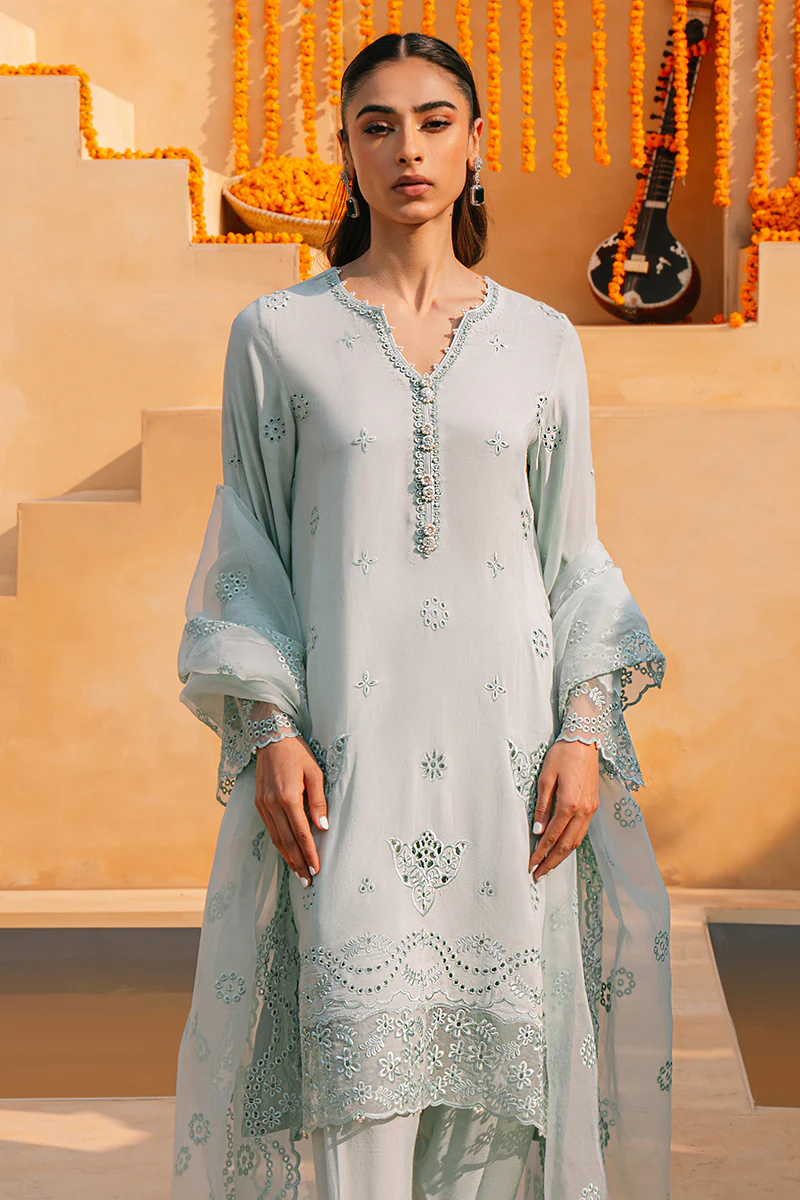 - Introducing our latest CLOUD BURST-3 PIECE SILK EMBROIDERED SUIT. Made from luxurious silk, this a-line mid length suit features exquisite front boring embroidery and a plain back. Adorned with embellished buttons, the neckline adds a touch of elegance. The sleeves and dupatta are beautifully embroidered with organza and completed with a silk border tapered shalwar. Elevate your style with this stunning suit.