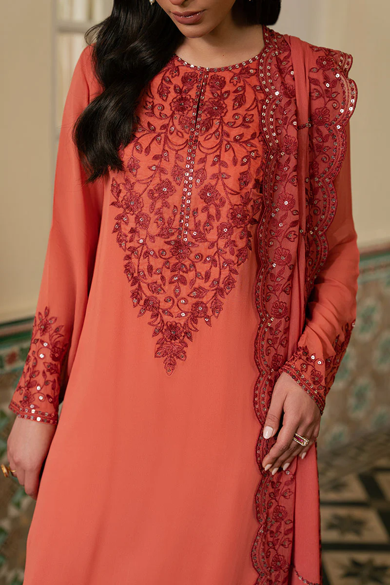 Introducing Faded Rose, an exquisite three-piece ensemble crafted for the discerning wearer. The straight-cut chiffon shirt features intricate embroidery adorning the crew neckline, regular sleeves, and side slits finished with elegant tasseling details. The back showcases dyed embroidery with matching slit embellishments. Paired with a luxuriously dyed silk trouser adorned with embroidered accents, this set is completed by a chiffon dupatta in complementary dyed tones, embellished with delicate tasseling. Each element demonstrates refined craftsmanship and attention to detail, creating a sophisticated silhouette perfect for formal occasions and celebrations.