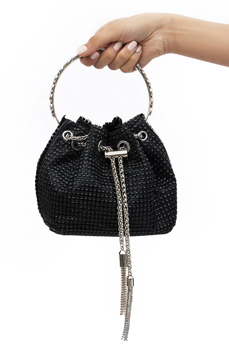 Black Crystal Mesh bag with silver handle on it, and chain drawstring closure