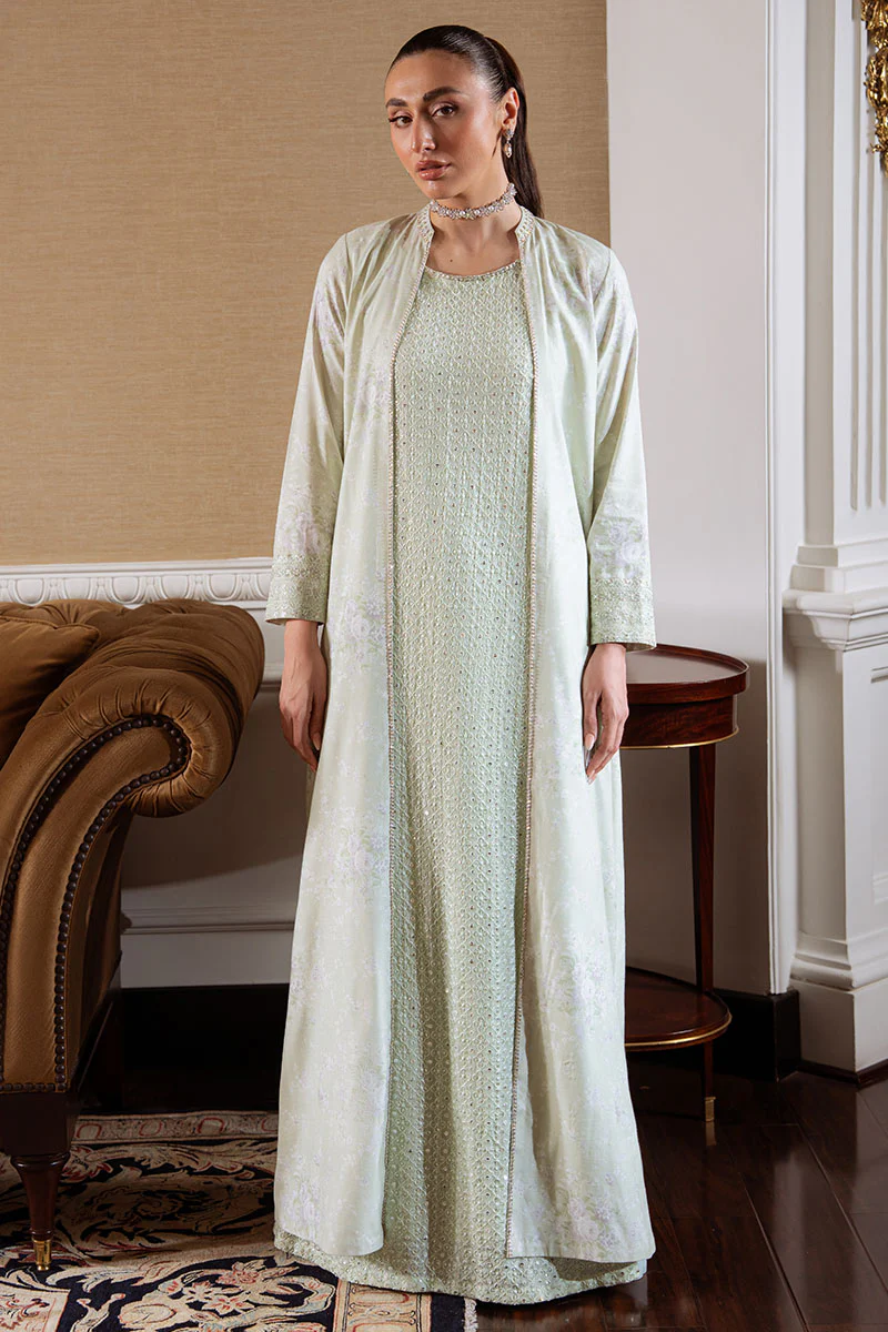 - This elegant 4-piece suit features a chiffon shirt with intricate embroidery on the front, back, and sleeves, paired with silk printed trousers adorned with a 115" embroidered patti for added detail. The ensemble includes a silk dyed slip for comfort and a silk printed dupatta enhanced by a 200" embroidered patti, creating a refined and cohesive look suitable for special occasions.