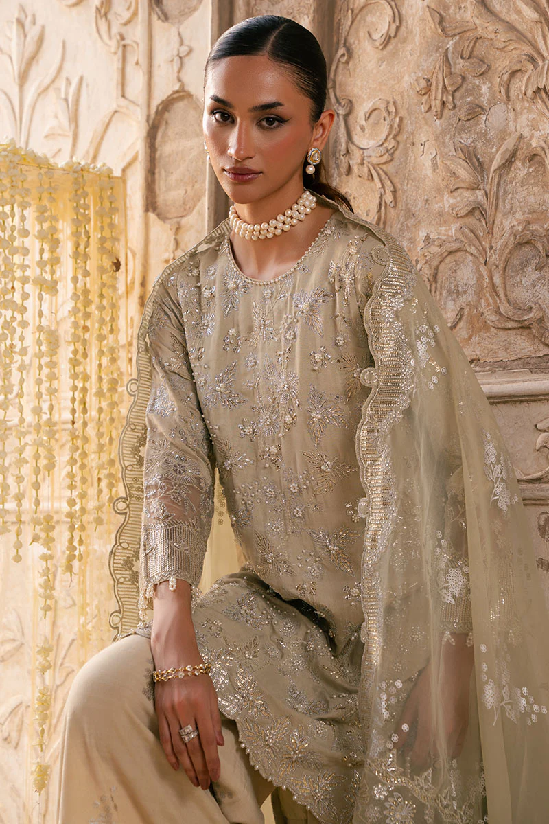 This Silver Mist 3PC Silk Embroidered Pret features a straight short silk shirt with intricate adda embroidery, taseling details, and a stylish back slit. The crew neck and regular sleeves are embellished with delicate taseling, enhancing its elegant design. Complemented by silk palazzo trousers dyed and foil printed for a modern touch. The ensemble is completed with a lightweight organza dupatta, adorned with foil-print embroidery and tassels, adding graceful movement and sophistication to your look. Perfect for those seeking refined texture and artisanal craftsmanship.