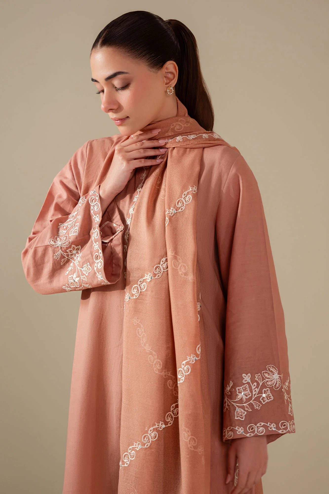 This elegant three-piece ensemble combines traditional craftsmanship with contemporary design. The long regular shirt features premium lawn fabric with intricate front dyed embroidery and delicate cutwork detailing, complemented by a dyed embroidered neckline ban and placket. The sleeves showcase matching dyed embroidery for a cohesive look. The set includes a beautifully dyed net dupatta with embroidered accents and coordinating lawn trousers in the same dyed finish. Perfect for formal occasions, this collection exemplifies refined tailoring and expert embroidery work, offering versatility and timeless elegance in a sophisticated sand clay palette.